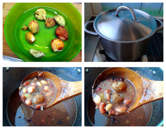 6. 先將紅腰豆、花生、黃豆、綠豆、黑豆、紅豆、薏仁米、豌豆、栗子這些較難熟的食材放入鍋中,加入適量水大火煮成半熟后再放入其余食材,煮開后轉(zhuǎn)小火繼續(xù)煮一小時左右。