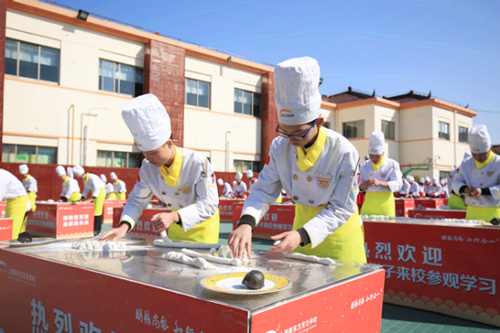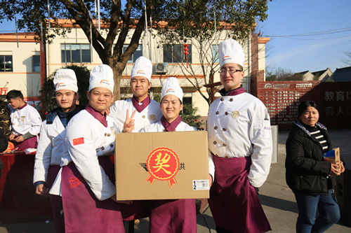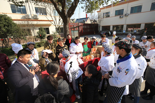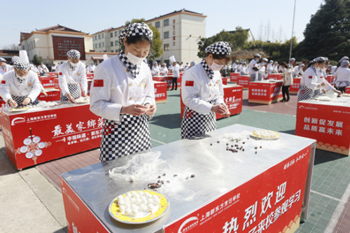 元宵節(jié)當(dāng)日清晨,上海新東方烹飪學(xué)校的操場(chǎng)上早已排列好一排排的桌子,其目的是為了即將開(kāi)始的百人包湯圓活動(dòng)。隨著冬日暖陽(yáng)的升起,包湯圓活動(dòng)也拉開(kāi)序幕。身著白色廚師服的同學(xué)們?cè)谥鞒秩说男枷麻_(kāi)始制作香甜軟糯的湯圓。