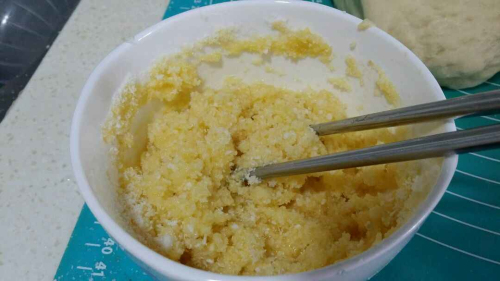 ?。?)加入椰絲和溶化的黃油攪勻冷卻后,加入發(fā)粉和面粉;