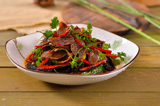 第六步、鴨胗里放多半香菜,拌勻,木耳黃瓜放在盤底,上面放上拌好的鴨胗,即可。