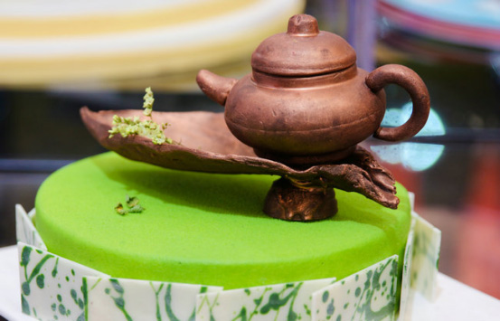 濃濃抹茶香的草綠色蛋糕底座上擺放著一個(gè)做舊的巧克力水壺,一份年代感油然而生,作品的亮點(diǎn)在于新東方烹飪大師們巧妙的利用巧克力本身的咖啡色,經(jīng)過特別制作,呈現(xiàn)出這種仿佛經(jīng)歷國時(shí)間淬煉的滄桑古樸之色。