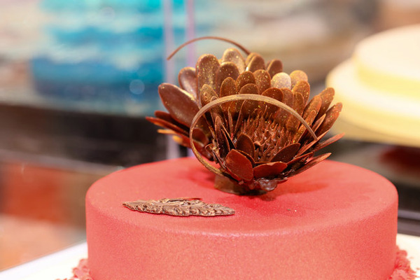 在那一抹烈焰紅中一株驕傲的巧克力花正在璀璨綻放,優(yōu)雅,從容。不同于裱花蛋糕上的奶油花,新東方烹飪大師們?cè)谥谱鬟@兩朵巧克力花的時(shí)候,需要將花瓣一瓣一瓣的制作出來,然后再利用巧克力易溶的特性組合起來。在這過程中,需要制作者熟練掌控好巧克力凝固和融化的溫度變化。