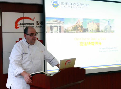美國強生威爾士大學烹飪教育系主任、烹飪藝術學院院長杰瑞·拉努扎(Jerry Lanuzza)在發(fā)言中代表美國強生威爾士大學對新東方烹飪教育的熱烈歡迎表示感謝,并向在座的領導介紹了大學的具體專業(yè)情況和辦學實力,同時他還表示很高興在美國南北卡華人工商總會的推動下,能夠與新東方有此次合作機會。