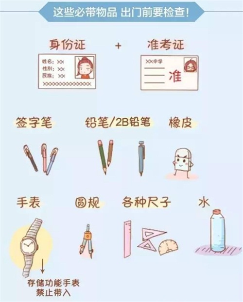 充足的準(zhǔn)備是高考成功的先決條件,對(duì)士兵們來說,武器是上陣殺敵的必備工具;而對(duì)考生們,考試工具更顯得尤為重要,考前檢查顯然是必須進(jìn)行的重要步驟。除了身份證和準(zhǔn)考證外,透明文具袋、2B鉛筆、黑色簽字筆、橡皮、直尺、圓規(guī)、三角板、半圓儀等均不可少,鉛筆和簽字筆至少帶2份,以便關(guān)鍵時(shí)刻應(yīng)急。