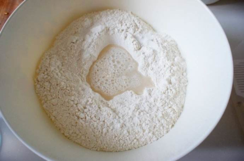 先將面粉倒在案板上(或面缸里),中間扒一小窩,加入冷水(為防止水外溢,水不宜一次加足,應分幾次加),用手從四周慢慢向里抄拌,待形成雪花片狀(有的也稱麥穗面、葡萄面)后,再用力揉成面團。揉至面團表面光滑并且有筋性、質地均勻時,蓋上干凈濕布靜置一段時間(餳面),再稍揉即可使用。
