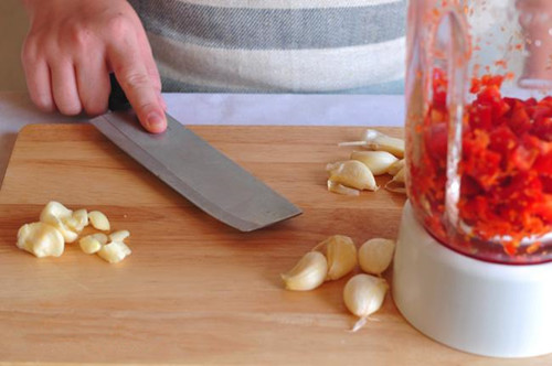 二、將辣椒放入攪拌機(jī)打碎,一般需要重復(fù)兩次。蒜可以直接搗碎。 辣椒和蒜的比例沒有具體數(shù)字,看個(gè)人口味。
