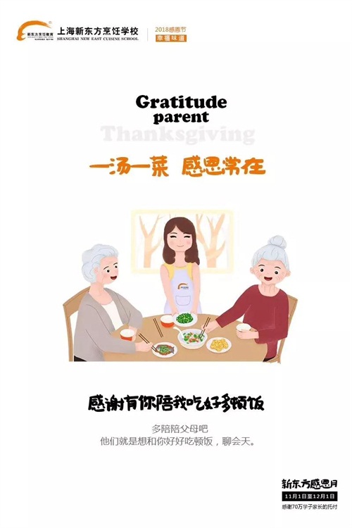 感恩節(jié)這天,這第一份感謝就是父母。不管你身在何處,給自己的父母送上祝福,給他們打個(gè)電話,再聽聽他們的“嘮叨”,有條件的,你可以為你的父母買上一份精心準(zhǔn)備的禮物,當(dāng)然,給你的父母做一桌豐盛的晚宴也是可以的。