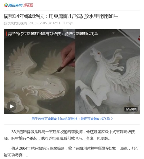 豆腐變飛馬、南瓜變鳳凰、芋頭摹麒麟......簡(jiǎn)單的食材被千雕百琢,變成觀賞性極強(qiáng)的精美作品,栩栩如生讓人過(guò)目難忘,精美至極收獲點(diǎn)贊連連,就連騰訊新聞也聞聲而動(dòng),把這些精美的作品推廣給你我觀賞。