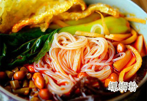 步驟六:將酸筍、木耳、花生、油炸腐竹、黃花菜、空心菜等各種配料小菜放到盛好的米粉上,最后澆上精心熬制的螺螄湯。