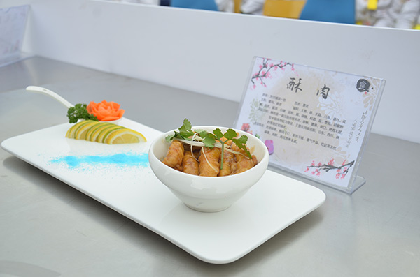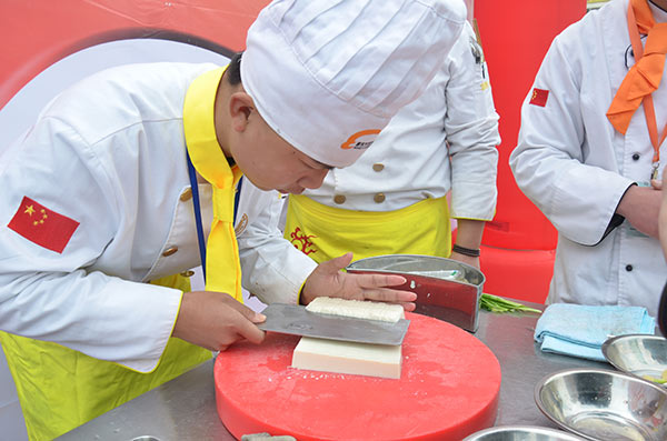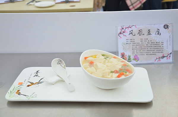 今天比賽的選手是金牌大廚班的巫佳豪與烹飪精英班的曹流,他們分別帶來家鄉(xiāng)特色的鳳凰豆腐與酥肉。只見巫佳豪小心翼翼地切著豆腐與配料,認真的表情讓圍觀的同學們也屏住了呼吸,生怕自己打亂了比賽選手的節(jié)奏。而曹流同學也毫不示弱,精準地控制著油溫,炸制著酥肉,保證菜肴的最好口感。