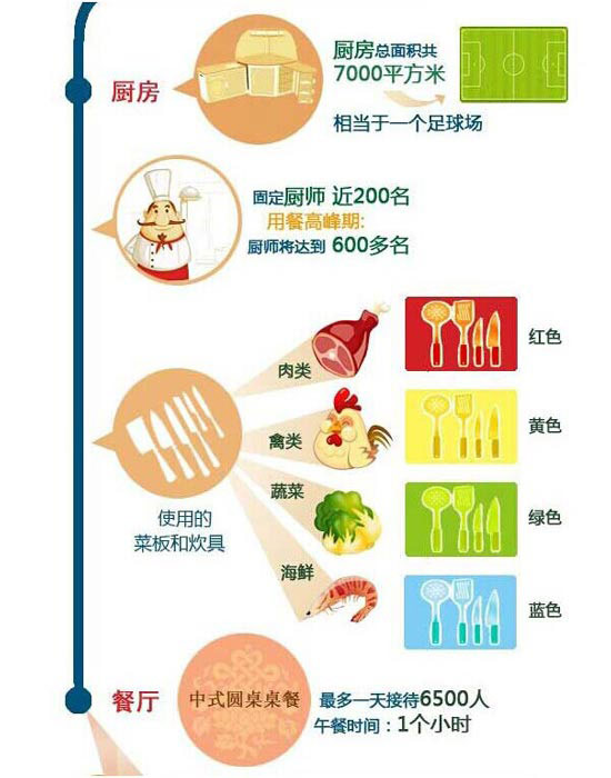 在APEC峰會期間,廚房面積達到7000平方米,相當于一個足球場大小。固定廚師就有近200名,而高峰期時有近600名廚師,其中,有西餐、西點、中餐等廚師各有分工,各司其責。在這個廚房里,不僅有中國的國宴廚藝大師,還有各國的廚藝大師。