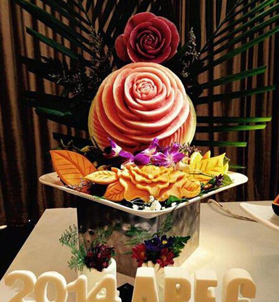有句話叫世界的美食,中國的新東方,其中的意思之一就是只有一個民族的美食,才是世界的,在會議期間,不僅要讓外賓吃的好,更要難忘,就必須展示出獨特的民族餐飲文化特色。中國自古就是美食的國度,在2014年的APEC將延續(xù)2001年上海APEC的晚宴,每一道菜都制作的精美無比,如一副副中國畫,獨具東方韻味,尤其是一些雕刻類菜系,雕刻出一副江南水墨的圖面,讓人嘆為觀止。例如今年的兵馬俑糖藝等。