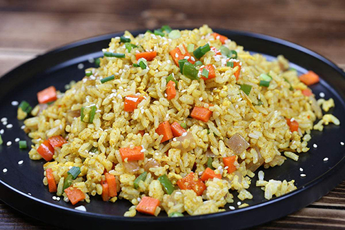 炒飯一定要用大火快速翻炒,不可炒太久,炒至熟就可出鍋,否則會出現(xiàn)水分越炒越少、飯越炒越干。特別是添加醬汁的炒飯,炒太干就無法達到豐盈濕潤的口感。而加入雞蛋的炒飯,蛋炒到半熟時就要加入米飯,炒后的飯上就會裹有一層金黃色。