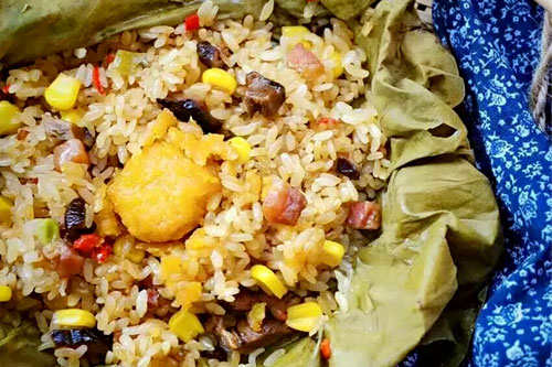 臘雞腿、咸蛋黃、香菇、玉米粒、豌豆、青椒、紅椒、糯米