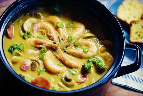 步驟一:將所有食材切塊。大蝦先用熱水燙熟備用。熱鍋涼油,油熱后將洋蔥、胡蘿卜先倒入鍋中翻炒,隨后放入土豆繼續(xù)翻炒。