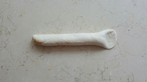 步驟七:由上至下卷起來(lái),雙手撮成約粗細(xì)均勻的長(zhǎng)條,用手按壓長(zhǎng)條面團(tuán)的一端,約3-4cm長(zhǎng),可以用搟面杖稍搟開(kāi)。