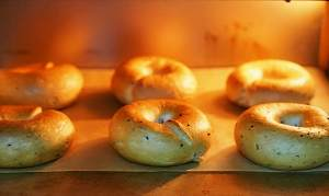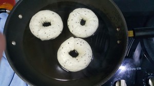 步驟十:發(fā)酵至近兩倍大,將發(fā)酵好的貝果,底面在上放入到90℃的煮貝果糖水中煮30-40秒,翻面 正面在上,繼續(xù)煮30-40秒,撈出放在吸水毛巾上稍吸干水后,把貝果放在烤盤上。