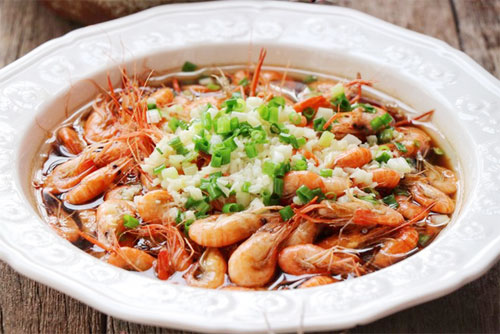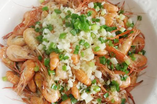 步驟四:將煮好的蝦放入盤中,蔥、蒜末放頂部。