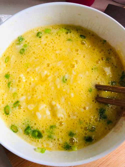 步驟一:剩米飯1碗,雞蛋4個,一起放在料理盆,加適量鹽、糖、雞精、蔥花。