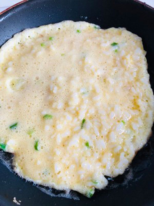 步驟四:把攪拌好的米飯雞蛋糊糊均勻地倒入鍋里,盡量讓中間和四周的厚度一樣。