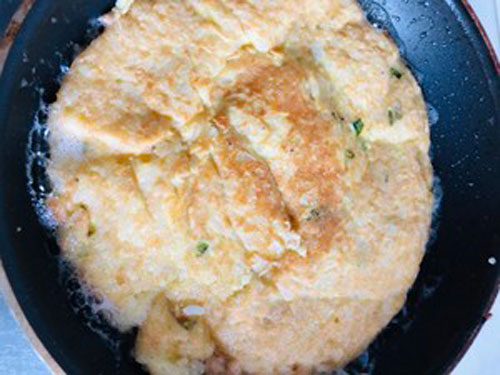 步驟五:等一面定型、顏色變成金黃,就開始翻面。