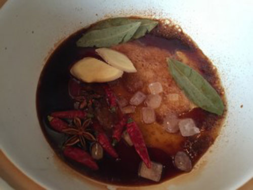 步驟三:砂鍋里加生抽5大勺湯匙,老抽一大勺湯匙,冰糖七八個,生姜三片、香葉三片,大料兩個,十個干辣椒,雞精少許,香油一勺半湯匙,鍋熱炒一下香料。