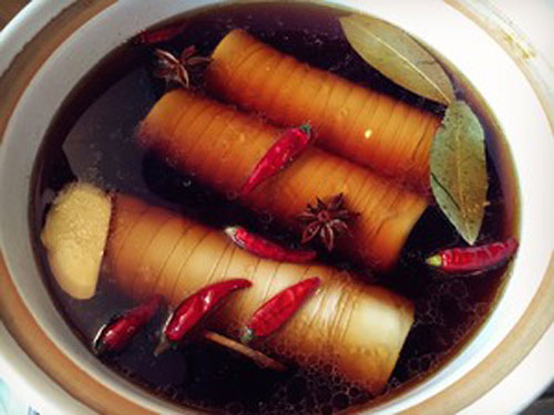 豆腐皮 3張、大料 2個、香葉 三片、生姜 三片、冰糖 十顆、食鹽 適量、老抽 一湯匙、生抽 5湯匙、干辣椒 10個、雞精 少許、棉線 一把、香油 一湯匙半