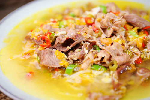輔料:黃燈籠椒醬 3大匙、白胡椒粉 1茶匙、料酒 1/2湯匙、陳醋 1/2湯匙、鹽 1茶匙、食用油 適量