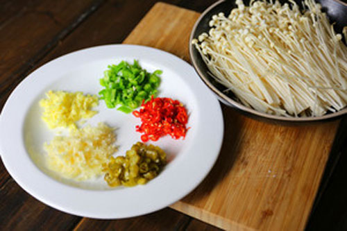 步驟一:姜蒜、杭椒、小米椒、野山椒切末,金針菇剪去根部撕開備用。