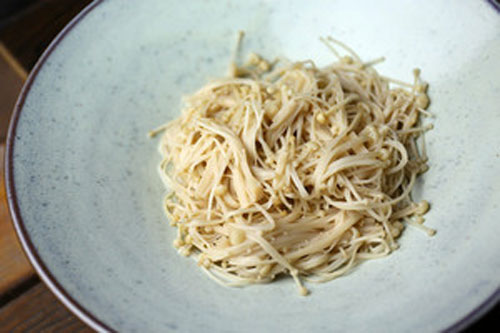 步驟三:金針菇下熱水鍋煮兩分鐘撈出,鋪在碗底備用。
