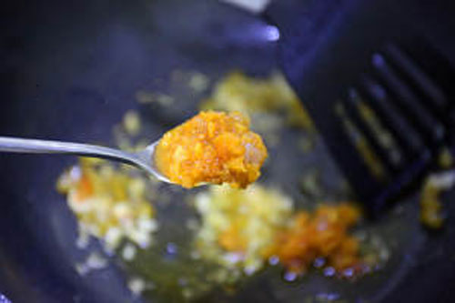 步驟四:鍋中加入適量菜籽油燒熱,爆香姜蒜末、野山椒末,接著放3大匙黃燈籠椒醬炒香。