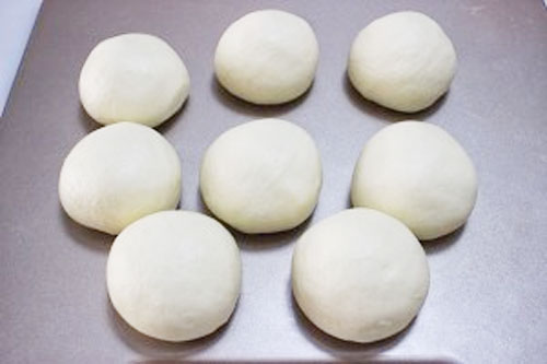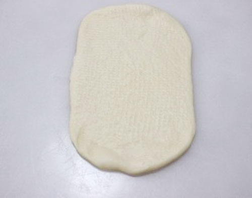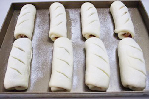 步驟五:卷起,捏緊收口,收口往下放入烤盤,入溫度34度,濕度80的發(fā)酵箱進行最后發(fā)酵,大概30到40分鐘后撒粉割包。