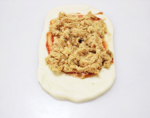 步驟四:抹一層番茄醬或者沙拉醬,鋪一層肉松,兩邊留空。