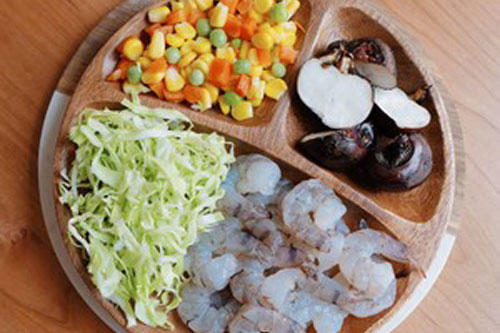 步驟一:準(zhǔn)備好食材,蝦肉剁成泥,卷心菜切絲,馬蹄切丁備用。