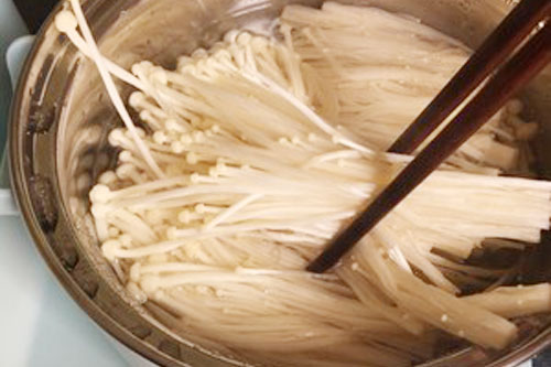 步驟二:金針菇洗凈切掉根部,放進(jìn)煮開(kāi)的水中焯半分鐘撈出。