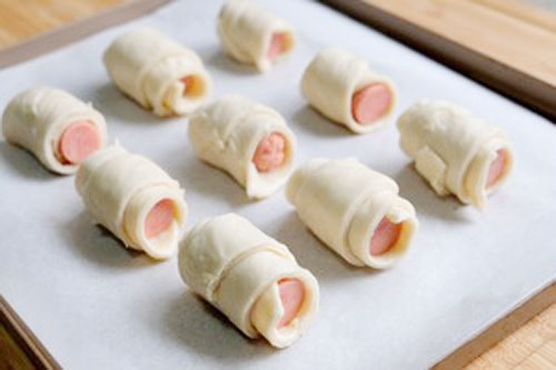 步驟三:火腿腸放至寬邊往尖頭卷,卷成可頌的樣子。