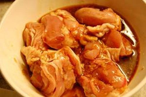 步驟三:雞肉塊放進1的醬汁里面拌勻,放進冰箱至少半小時左右入味。