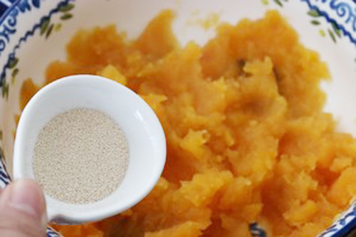 步驟一:紅薯去皮切塊上鍋蒸熟,加入白糖攪拌均勻,加入酵母攪拌均勻。