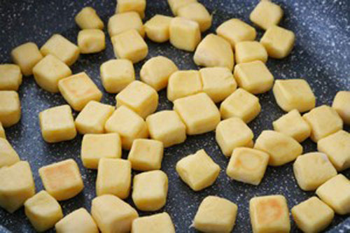 步驟四:排氣后搟成片狀,先切條再切小塊,平底鍋刷油,將其放入定型后小火翻炒,至表面上色,體積膨脹,有彈性即可出鍋。
