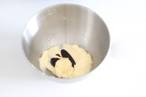 步驟一:提前軟化黃油,用手指稍許用力能按壓出小凹坑的狀態(tài),過篩加入糖粉和海鹽,糖粉容易結(jié)塊,用刮刀壓拌均勻至無干粉,防止打發(fā)的時候糖粉飛濺,然后加入香草膏。