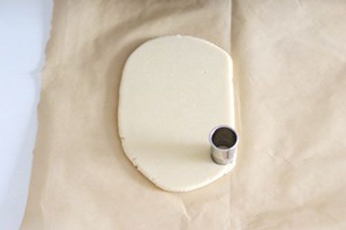 步驟五:壓壓扁后蓋上另一半油紙,用搟面棍搟開成1cm的厚片,用壓圈壓成你需要的大小,邊角料可以重復(fù)搟開整形。