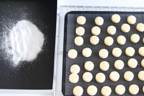 步驟六:壓好的餅干先放在烤墊上,然后送入冰箱冷藏20分鐘后取出,另一個烤盤上放上細(xì)砂糖,戴上手套在餅干周圍滾一圈細(xì)砂糖,再整齊的擺在透氣網(wǎng)墊上。