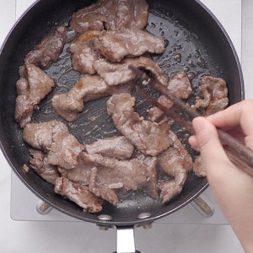 步驟二:鍋內(nèi)燒熱,倒油,放入牛肉片,用筷子一片片撥開,肉變色即可,撈出備用。