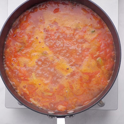步驟三:鍋內(nèi)放油,爆香蔥段、姜絲,放入番茄塊,不停翻炒至出汁,加入番茄醬和清水,煮開。