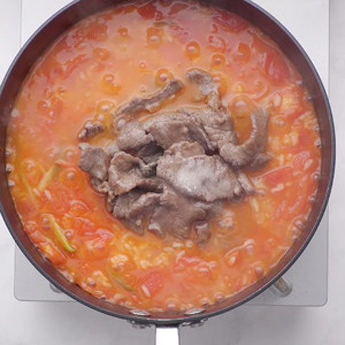 步驟四:放入米飯、鹽、糖、少許黑胡椒粉,翻勻,最后放入牛肉片,略微煮一煮,湯汁收濃即可。