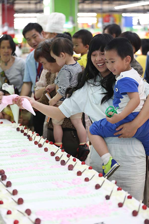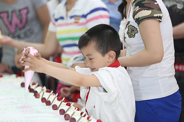 6月1日是小朋友們的節(jié)日,忙碌的家長們在這一天也緩下腳步陪孩子們?nèi)ネ嫠?,整個世界都對孩子們露出一個大大的微笑。甜蜜的蛋糕就像孩子臉上的酒窩,上海新東方烹飪學(xué)校的師生們齊心協(xié)力制作了長達(dá)6米1的蛋糕,邀萌娃們和家長一起品嘗,共享六一的幸福時刻。