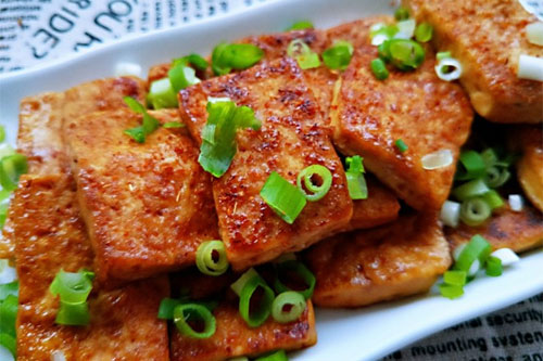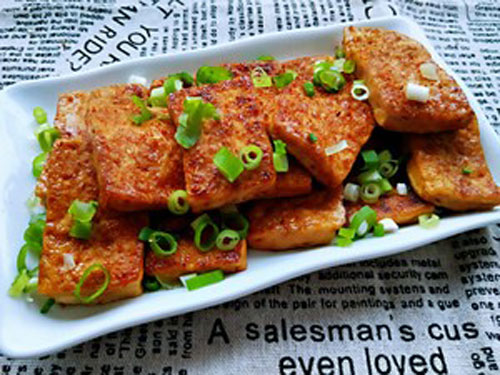 步驟三:平底鍋內(nèi)倒入適量油,擺入豆腐塊,小火煎至豆腐塊兩面金黃,倒入攪拌混合好的調(diào)料汁,繼續(xù)煎至收湯汁,裝盤撒燒烤蘸料和小蔥即可。