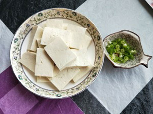 步驟二:豆腐切成1厘米厚的方塊,小蔥洗凈備用。
