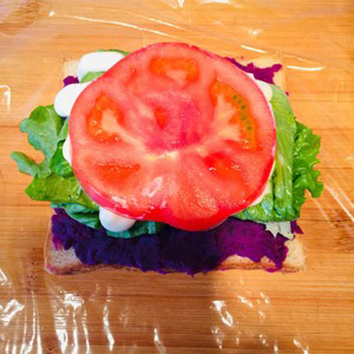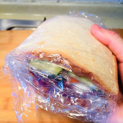 步驟八:放上另一片吐司,用保鮮膜緊緊裹起來,用刀從中間切開即可。