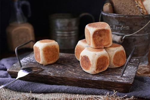 步驟五:將靜置好的面團(tuán)取出,放在撒了少許面粉的案板上,搓成長(zhǎng)條,分成27g每等份(共13個(gè)),分好的面團(tuán)用保鮮膜蓋上,避免水分流失,面團(tuán)用手心按扁,用搟面杖搟成中間厚四周薄的圓形,面皮放入紫薯芝士餡心,包好收口朝下,用刮板整形成方形,平底鍋預(yù)熱,開(kāi)中小火,鍋?zhàn)颖砻嫠⑸仙僭S食用油,放入紫薯仙豆糕,煎至6面呈金黃色即可。